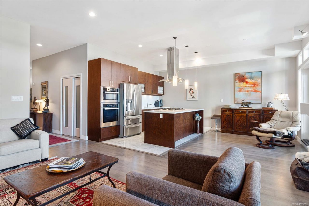 Welcome home to modern living that meets coastal beauty in the heart of Nanaimo's walkable waterfront district. This 2 bedroom + den, 2 bathroom unit offers stunning ocean and mountain views with a functional and stylish layout, and high-end finishes throughout. The gourmet kitchen features quartz countertops, soft-close cabinetry, large island, and Miele appliances. The open concept living space seamlessly connects the kitchen, dining, and living areas to your spacious covered balcony. The primary suite includes a walk-in closet and a spa-like ensuite with heated tile floors, soaker tub, marble tile and glass shower surround. Additional...read more