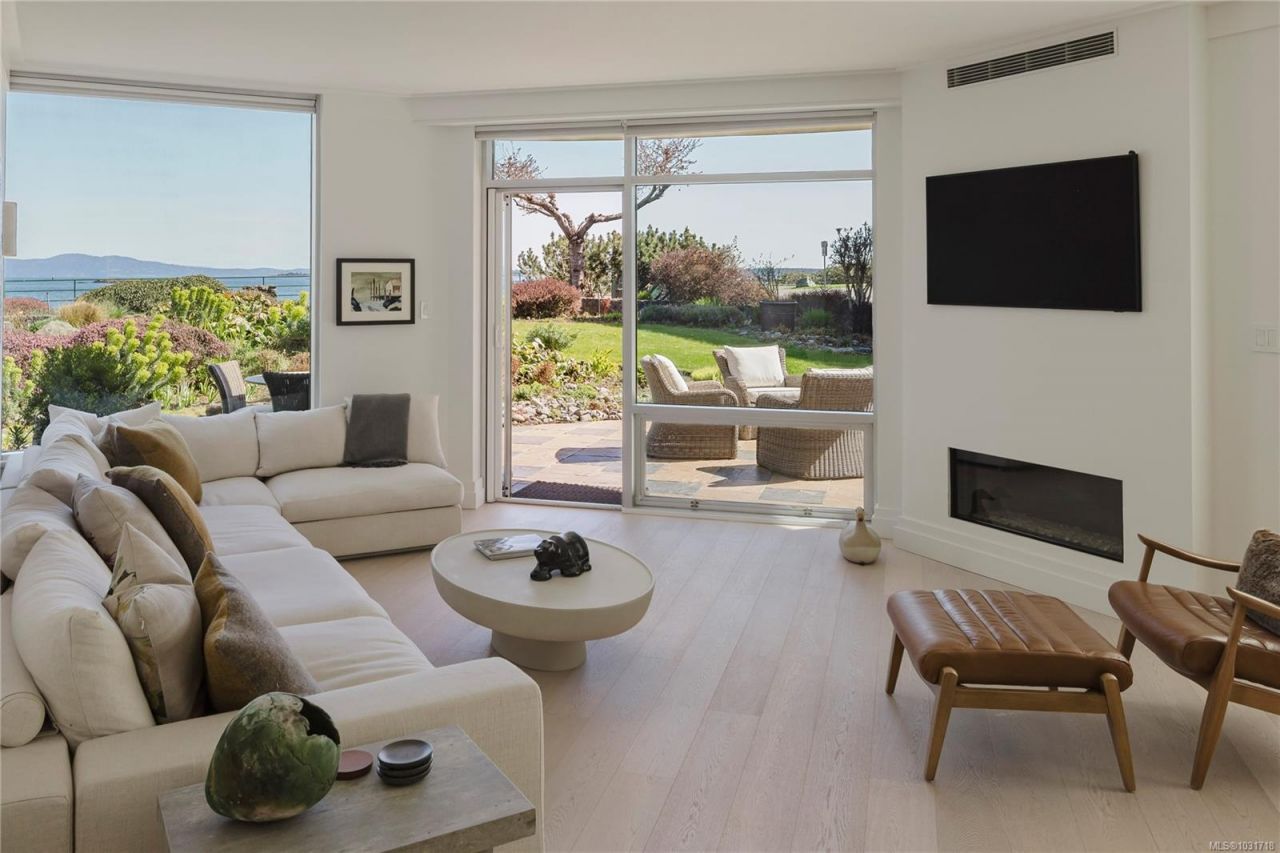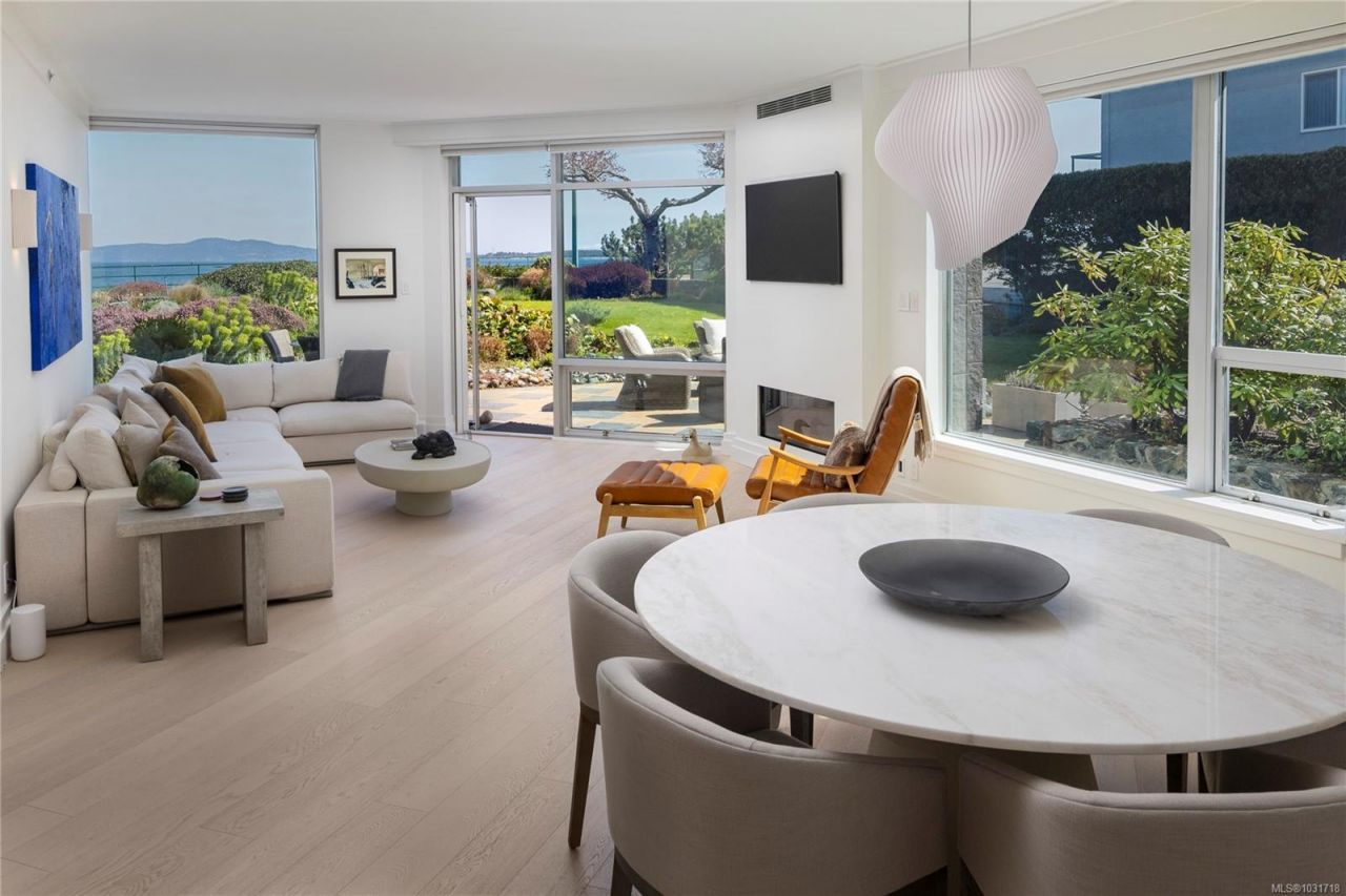 Discover this stunning garden-level home situated on the waterfront in Oak Bay offering unobstructed views of the ocean and Mount Baker. This newly renovated home boasts an open floor plan of over 1600 square feet with 9-foot ceilings, natural stone counters, upscale appliances, including subzero, and Wolfe. This layout features beautiful hardwood floors and two large bedrooms with ensuite washrooms. The building is concrete with a slate tile exterior, concrete, party walls, and a floor in floor radiant hot water heating.