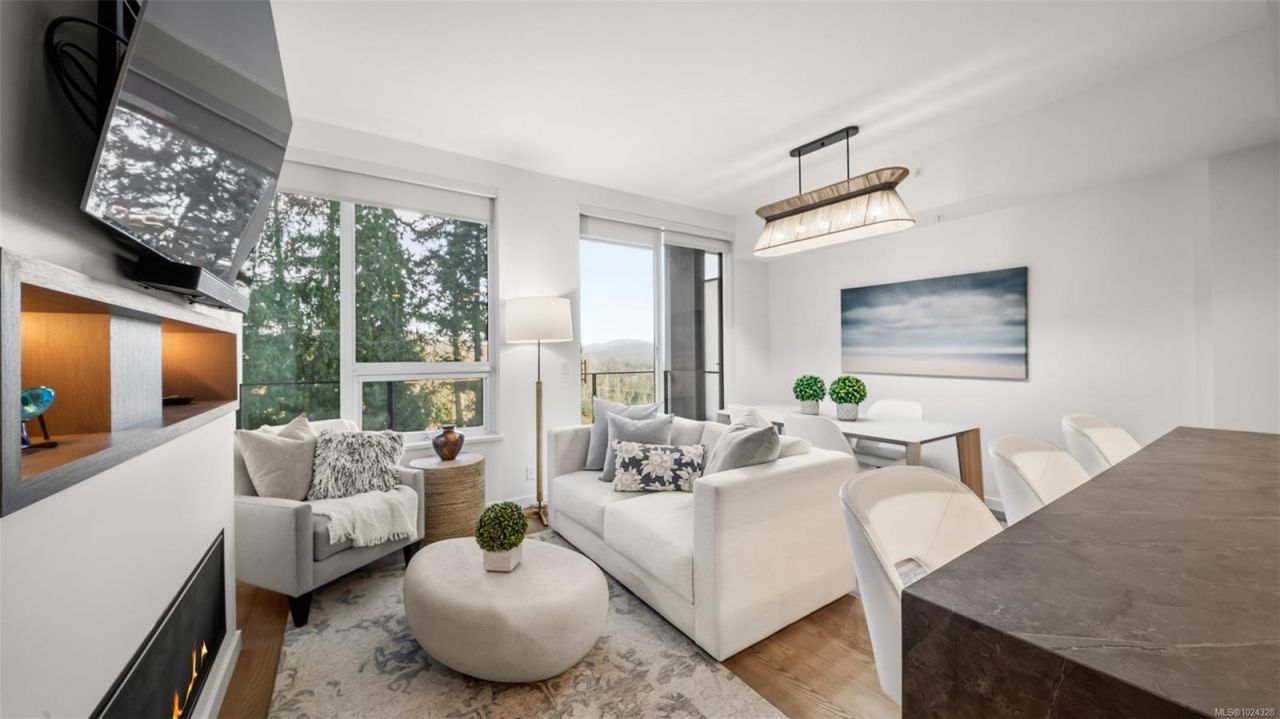 Elegant suite at One Bear Mountain offers tranquil living with concrete construction & bright, thoughtfully designed layout. This elegant 2 bed, 2 bath home spans nearly 1,105 sqft with high ceilings, expansive windows, a cozy gas fireplace, spacious balcony with mountain & forest views, and a peaceful creek to listen to as you fall asleep. The open-concept kitchen features premium cabinetry, quartz countertops & quality integrated appliances, flowing seamlessly into the living & dining areas. The primary bedroom includes a walk-in closet and ensuite, while the second bedroom is ideal for guests or a home office. Enjoy in-suite laundry, A/C,...read more