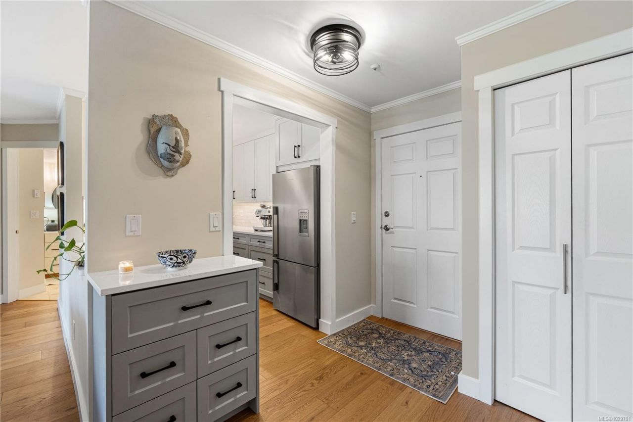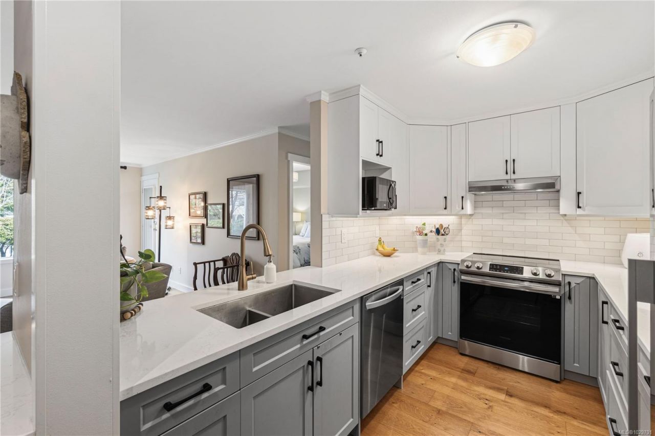 Bright, modern, and move-in ready ground-floor condo in desirable Rocky Point! This beautiful 2 bed, 2 bath home features bedrooms on opposite sides for privacy. Updated kitchen with newer Fisher & Paykel fridge and new stove/oven, plus new flooring, light fixtures, and gas fireplace surround. Large windows bring in abundant natural light throughout the home. Enjoy a private patio with hedging and flowers?perfect for relaxing. Spacious primary bedroom offers two double closets and an ensuite, while the second bedroom or den includes built-in shelving and sliding doors to the patio. In-unit laundry with storage. Quiet, well-maintained building...read more
